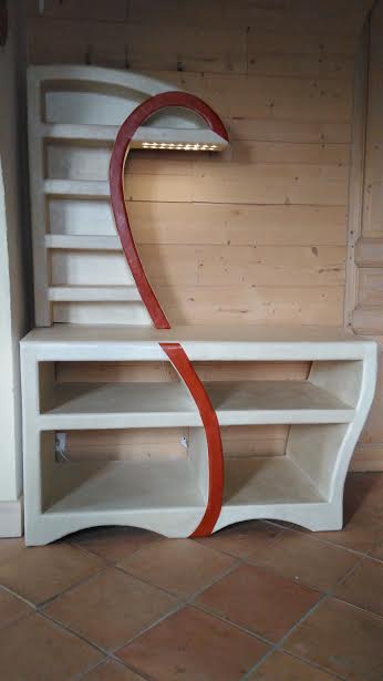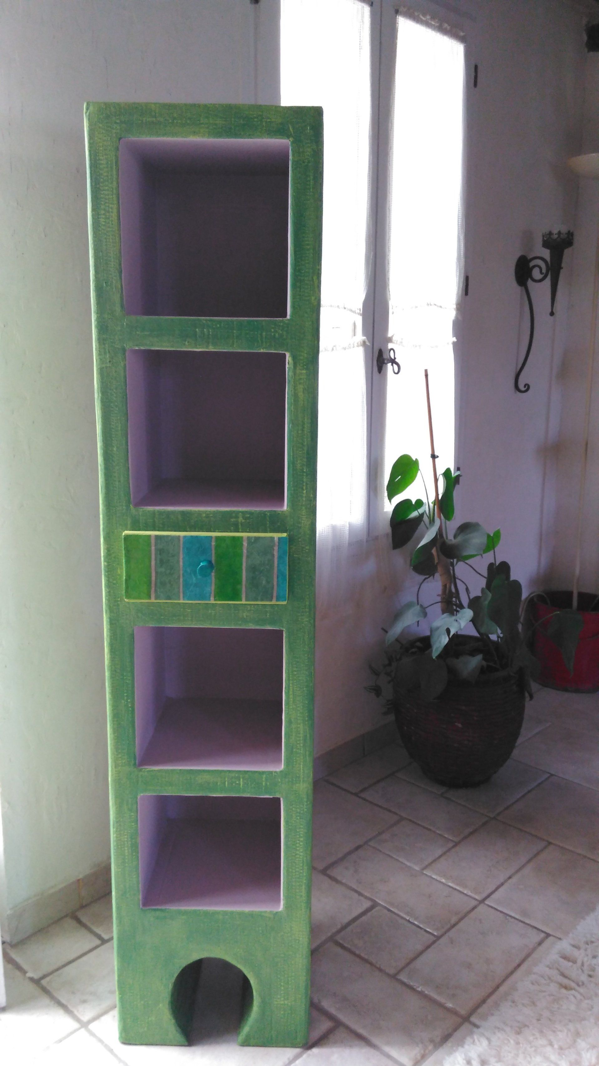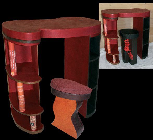 Je dessine précisément sur le carton les parties du meuble à réaliser; puis par un système d'encastrements et/ou d'emboîtements, complétés par de la colle,